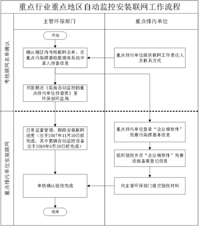 氮磷排放重点行业的重点排污单位,应于2018年6月30日前安装总氮、总磷排放自动监测设备并与环保部门联网;其他行业重点排污单位自动监测设备,应于2017年11月30日前与环保部门联网;自动监测设备已经安装并联网、但不符合本通知安装技术要求和有关标准规范的,应于2017年11月30日前完成改造;在建的重点排污单位,应在试生产时安装自动监测设备并与环保部门联网。